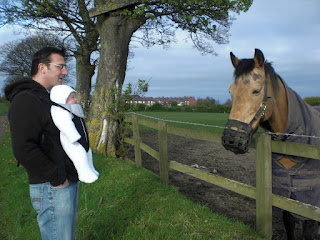 On Thursday I took mummy and Bella for a walk. Mummy looked a bit crazy with a baby in a sling and a doggy on a lead but we managed 15 minutes round the block and Bella was happier for this. On the way back home we visited Saltwell Park which is very pretty and I saw a playground that I would have liked to play in but mummy insisted that I was 'too small' (what a killjoy/guastafeste!). That evening we went on walk number three with daddy as he got home early so we went to the fields and woods near our house. We saw lots of wild primroses and bluebells but my favourites were the horsies. I stayed awake the whole way round which is pretty difficult for a baby when you're getting rocked so much!