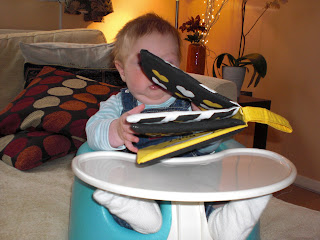 My neck is very strong now and I'm getting really good at sitting up on my own for a few seconds and lying on my tummy with my head and shoulders off the ground. This is great because I can play with more toys and also sit in my special seat called a Bumbo which allows me to explore books and things on my own without mummy constantly interfering!