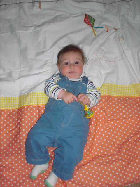 In terms of my progress this week, I managed a double roll on the carpet in my room. I've also started trying to crawl but I always seem to end up further away from the object I like which is very annoying after a while. I'm getting very good with my hands now, especially pulling mummy and daddy's hair, face, eyes and necklaces. I'm also becoming confident with a rattle. I am talking a lot but no one seems to understand me. It might be because I sometimes forget to open my lips so just mumble a lot to myself. I am very strong now and managed to kick the water off the changing table this week. Mummy said 'Oh dear, never mind you didn't mean to', but then I laughed at her to make sure she knew that I had done it on purpose! It's great being a baby, I get away with everything!