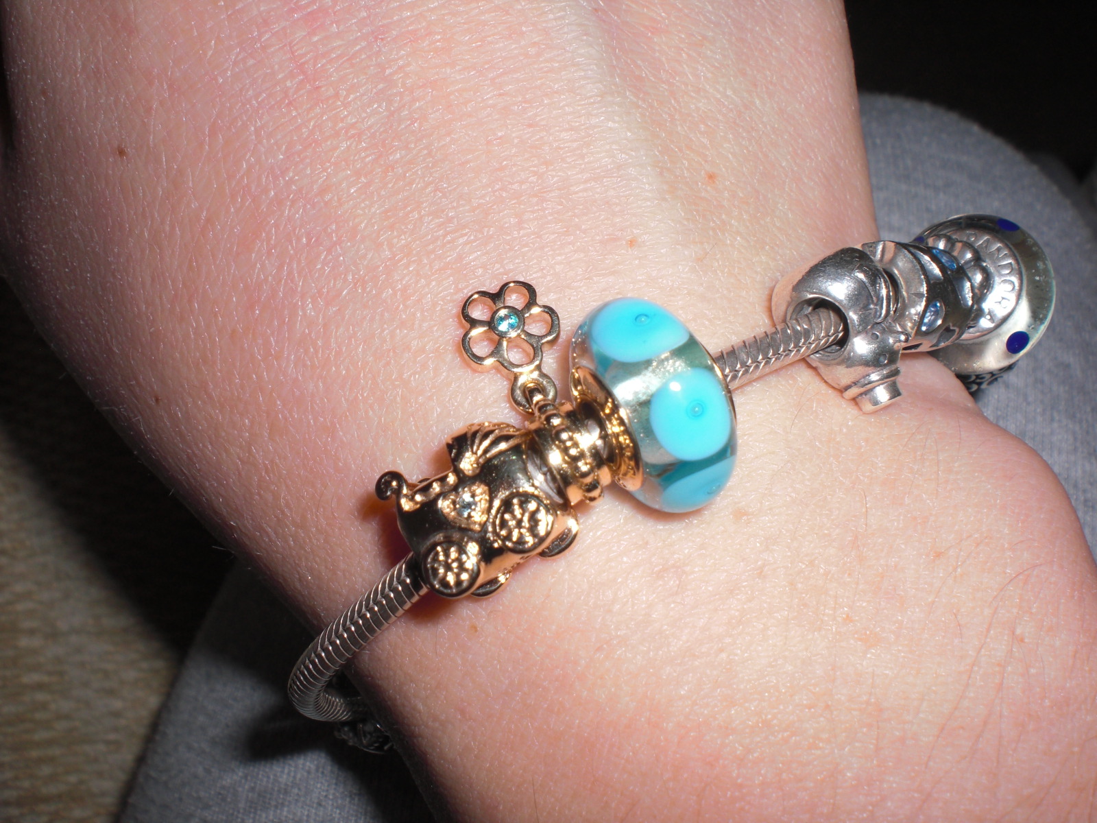 Today I woke up in time to see daddy off to the dentist. Mummy and I spent some quality time together (feeding). When daddy got back he had bought mummy some beautiful lilies, a card and later a very special surprise for her bracelet to say thank you for giving birth to me. Mummy was very happy with this, especially the little golden baby carriage. All the gold ones are new!
